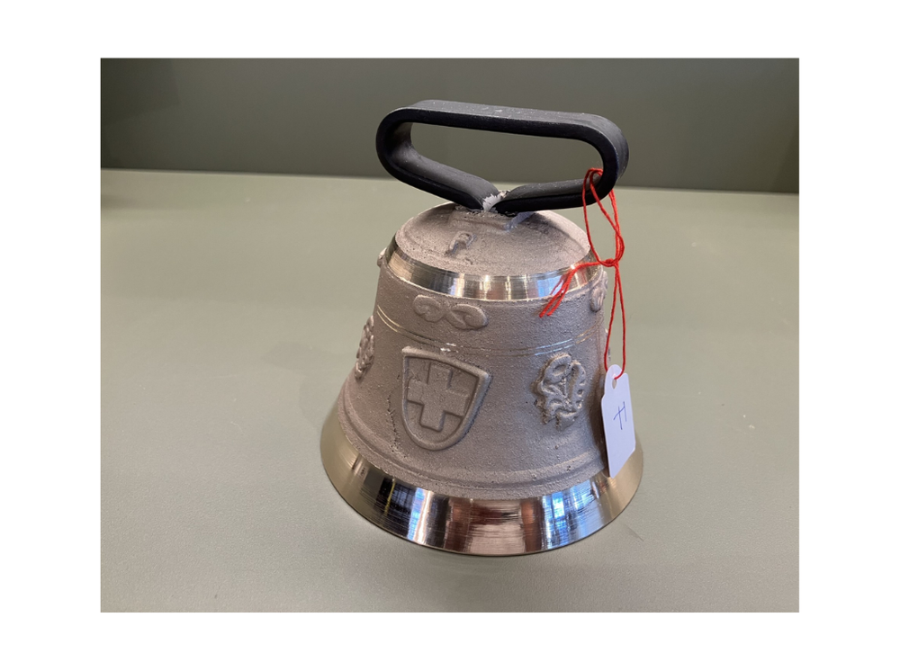 Elegante campana in bronzo con decorazioni tradizionali e stemma svizzero, realizzata da una storica fonderia elvetica. Un oggetto autentico, perfetto per collezionisti o come elemento decorativo.