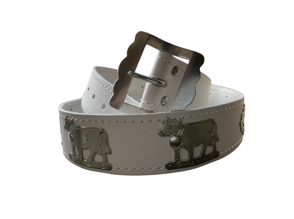Cinture in pelle bianca con classici motivi appenzellesi argentati, di 4 cm di larghezza, in diverse misure.