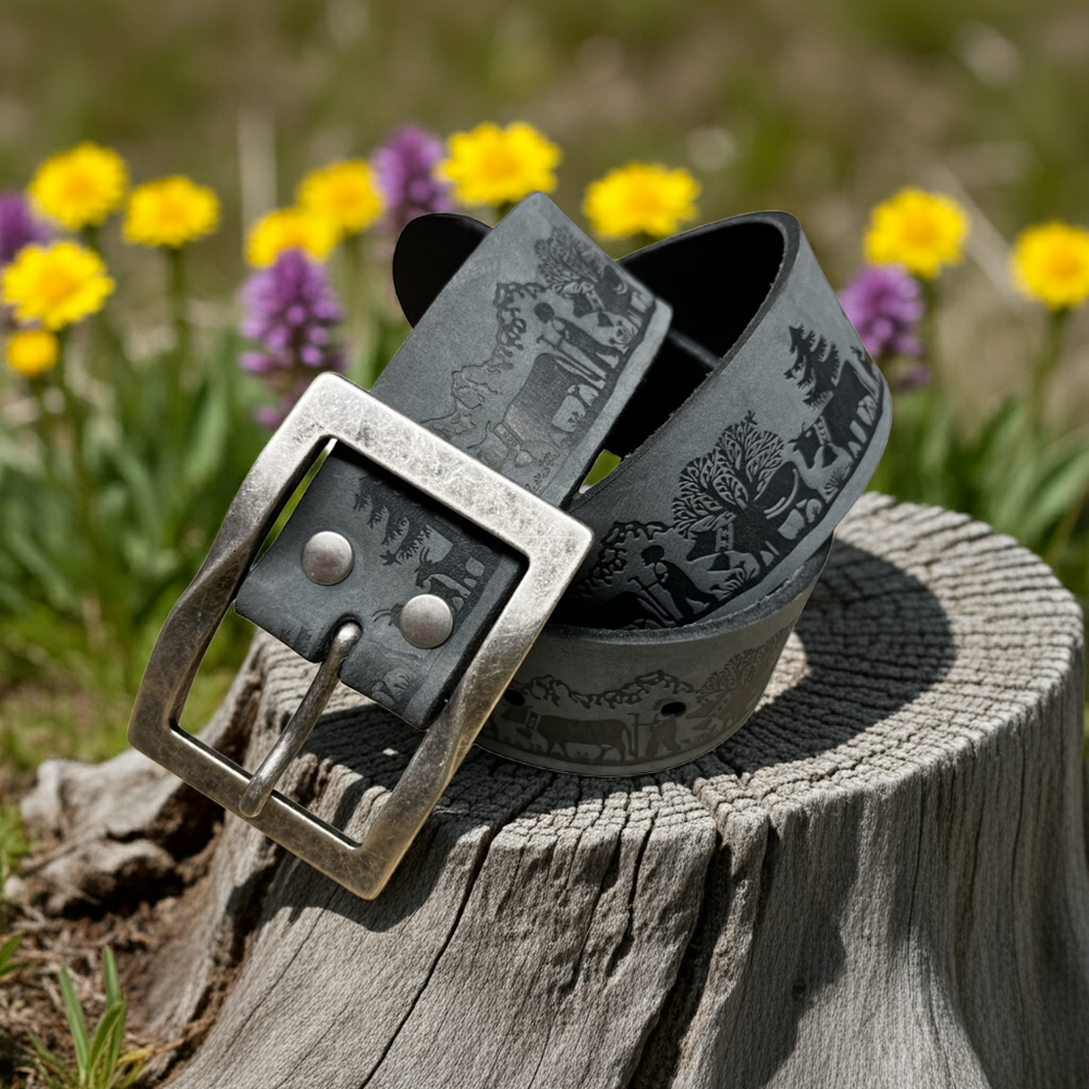 Cintura in pelle con incisione a motivo pascolo alpino