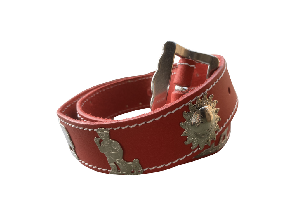 Cinture in pelle rossa con classici motivi appenzellesi argentati, di 4 cm di larghezza, in diverse misure.