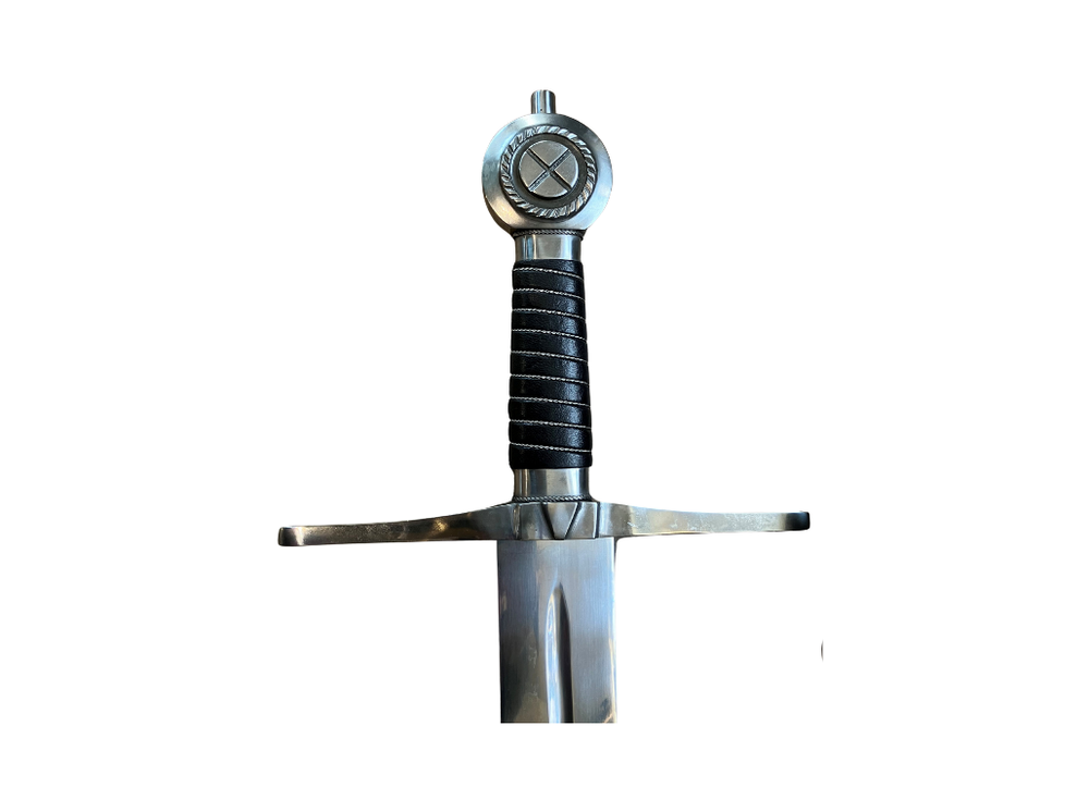 La spada di Robert Bruce, re di Scozia, è una fedele replica storica dell’arma brandita dall’eroe nazionale che guidò la Scozia nelle guerre d’indipendenza. Forgiata a mano in acciaio al carbonio 1065, questa imponente spada medievale unisce potenza e simbolismo. L’impugnatura in pelle nera è rinforzata da una catena d’argento, mentre il pomo reca la croce di Sant’Andrea.