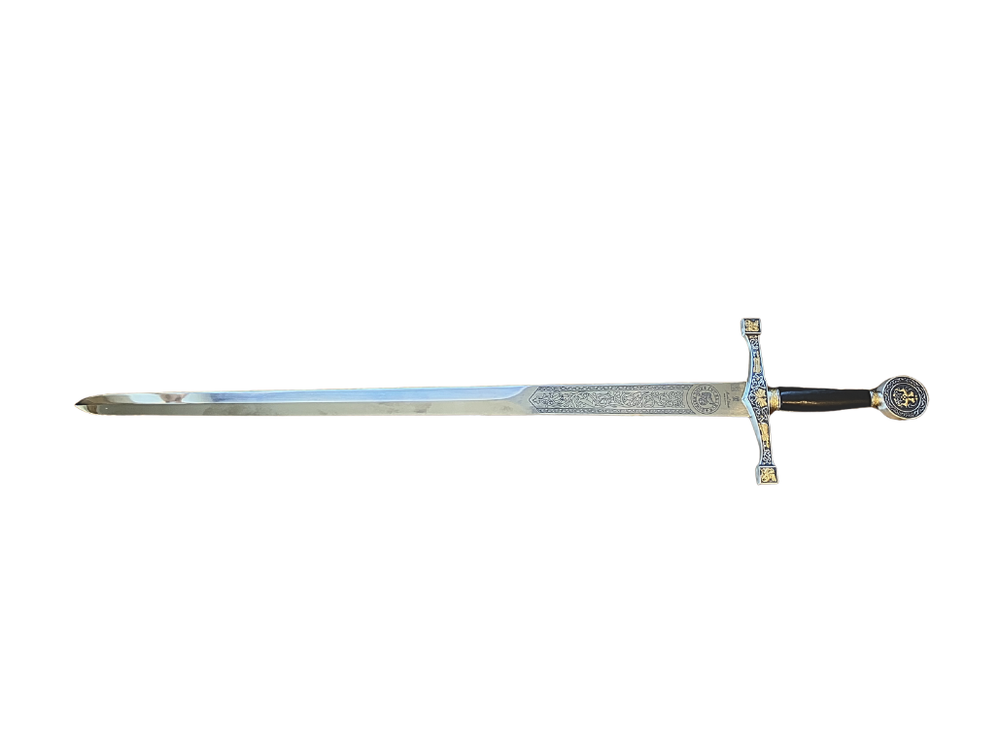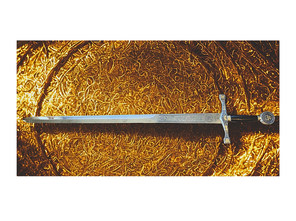 La Spada Excalibur color oro di Marto è una riproduzione della leggendaria arma di Re Artù. La lama in acciaio inox, lunga circa 94 cm, è finemente incisa e il manico dorato, con pomolo lavorato, dona al pezzo un aspetto nobile ed elegante. Con una lunghezza totale di 120 cm e un peso di 2,1 kg, questa spada decorativa è un autentico gioiello per collezionisti e appassionati di armi medievali. Perfetta come oggetto da esposizione, per rievocazioni storiche o come regalo di prestigio.