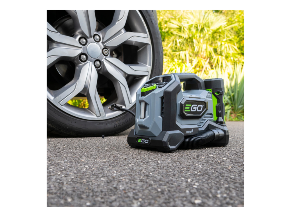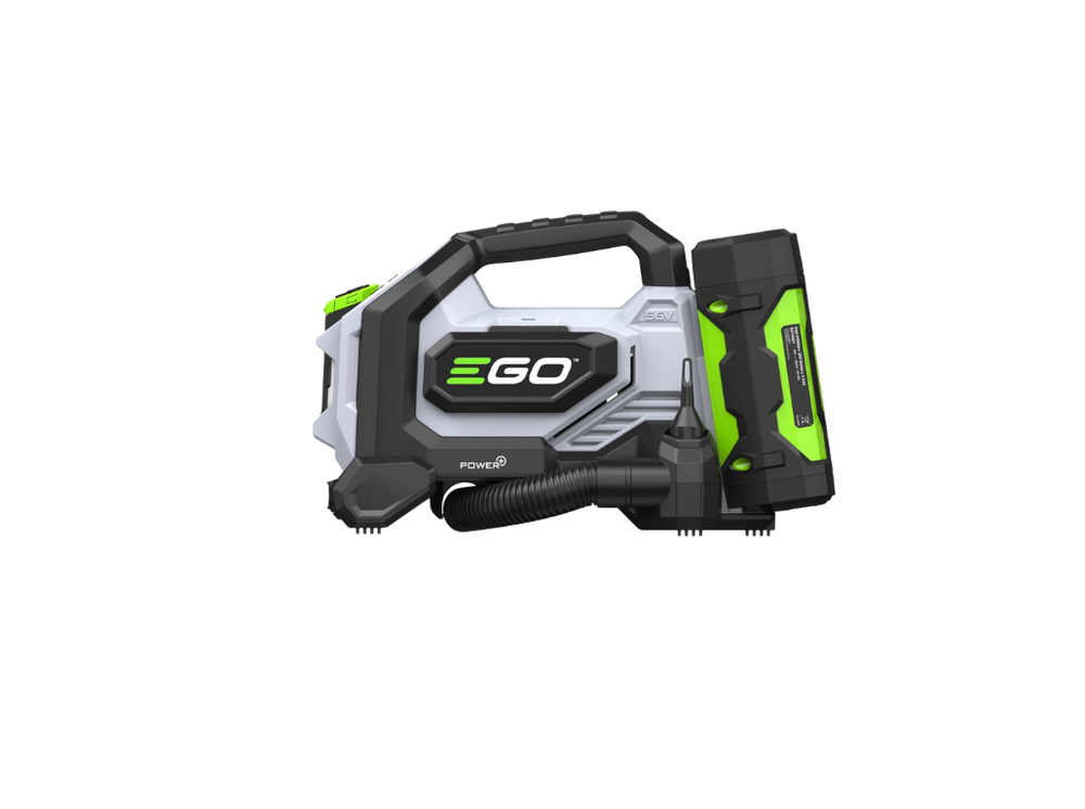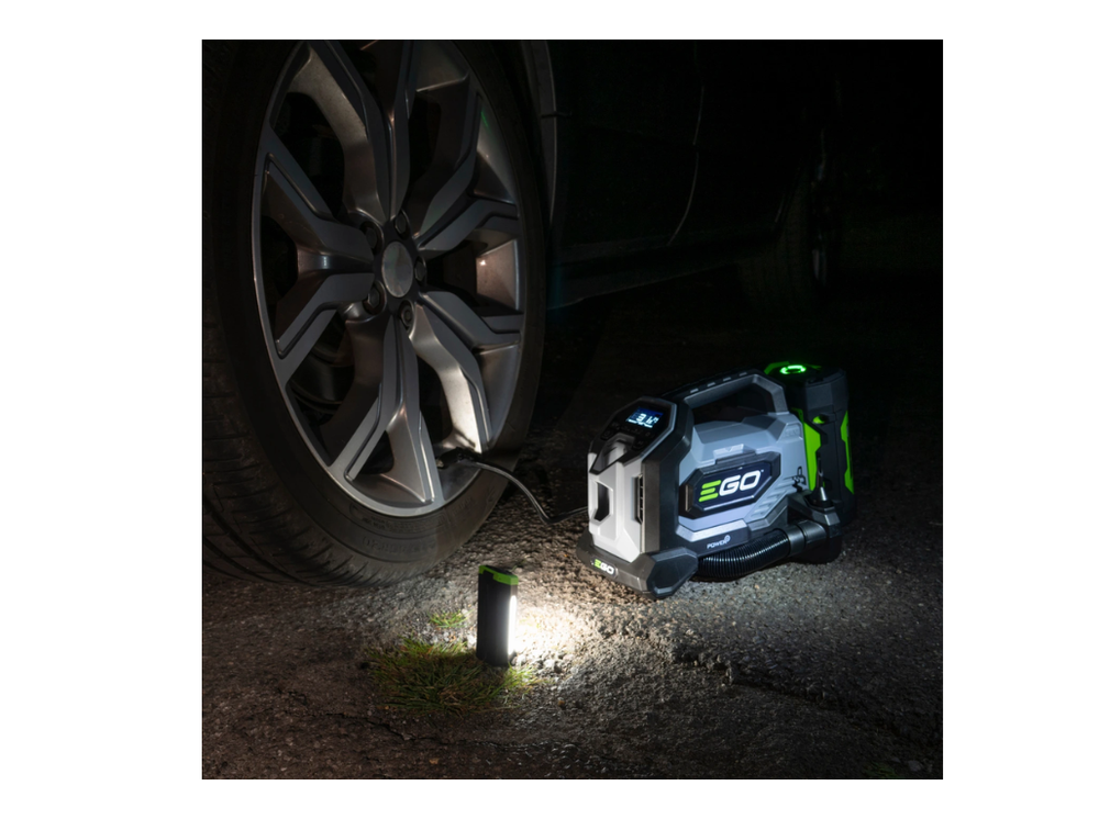 Compressore a batteria EGO potente, versatile e veloce, con modalità alta pressione e alto volume. Ideale per pneumatici, attrezzature sportive e gonfiabili, con faro LED removibile per lavorare anche in condizioni di scarsa visibilità.