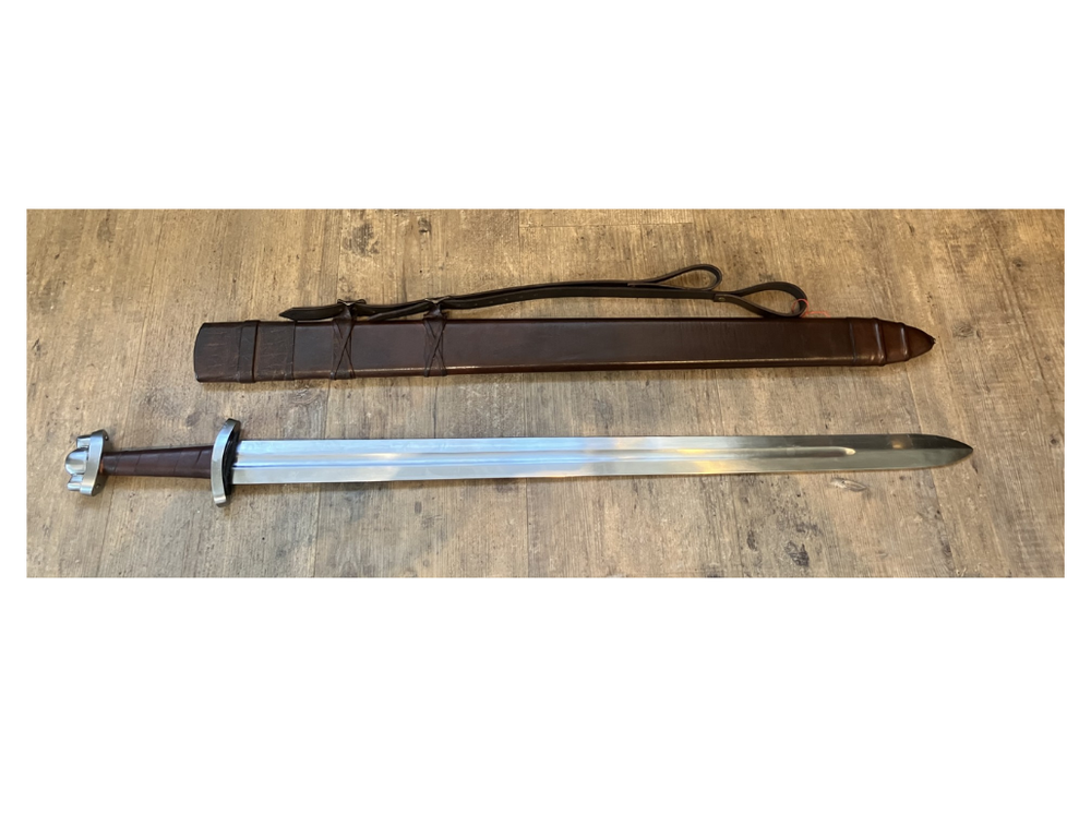 Spada vichinga Godfred con fodero in pelle e legno. Realizzata a mano in acciaio per molle EN45, ispirata al modello altomedievale dell’VIII secolo. Lama dritta a doppio filo con piombino, guardia e pomo in ghisa termotrattata, impugnatura in cuoio. Lunghezza totale 94 cm, lama 79,5 cm, peso 1,1 kg. Inclusi fodero in legno e pelle con fibbie.