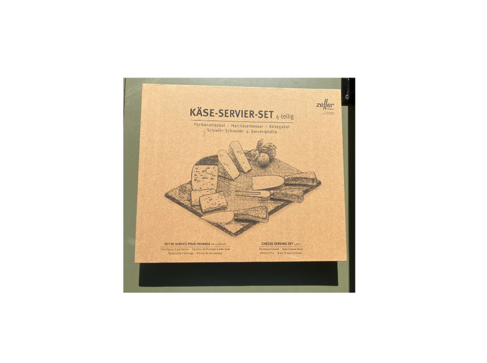 Set da servire per formaggi Zeller Present, 4 pezzi con elegante base in ardesia naturale (24x18 cm). Include coltello per parmigiano, coltello per formaggi duri, forchetta e piastra da taglio/servizio. Presentato in una raffinata confezione regalo, è perfetto per gli amanti del formaggio o come dono elegante per ogni occasione.