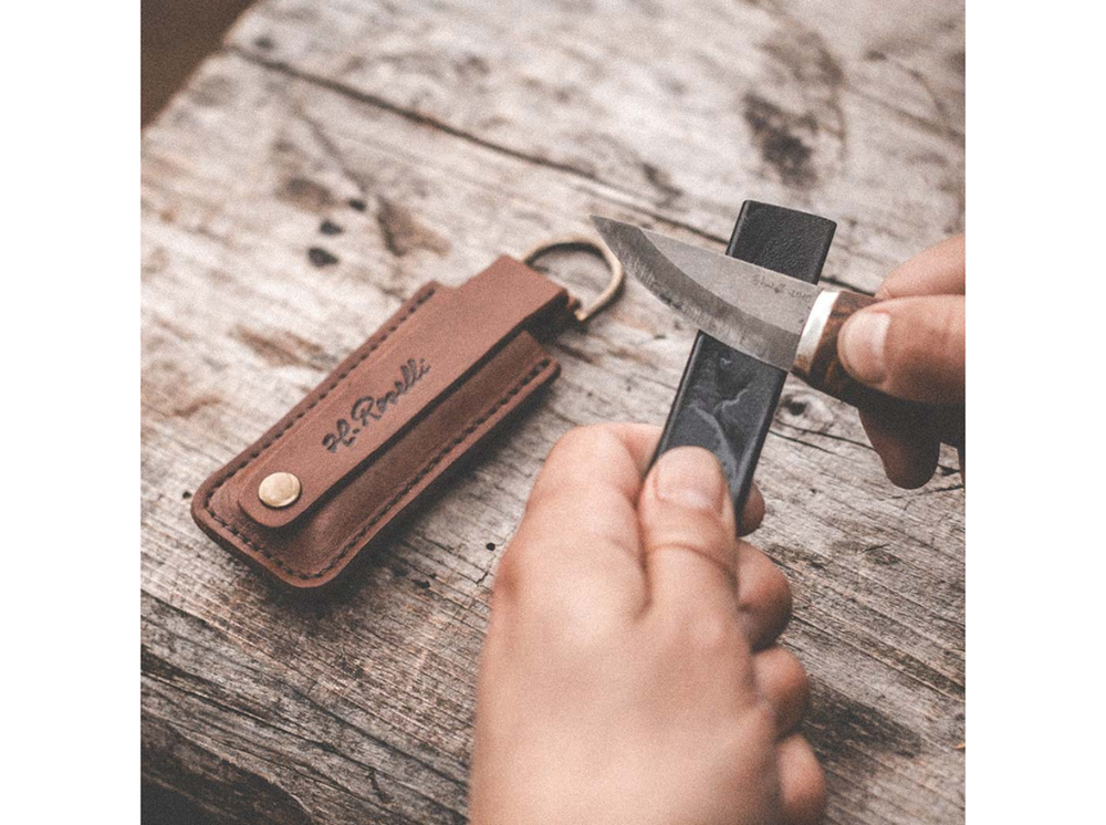 Der Roselli-Schärfstein mit Lederscheide ist ein praktisches und langlebiges Werkzeug zum Schärfen Ihrer Messer. Hergestellt aus Wästikivi-Phyllit , einem hochwertigen Naturstein, eignet er sich sowohl zum Grundschärfen als auch zum Feinschärfen.